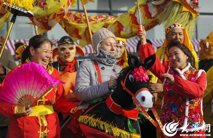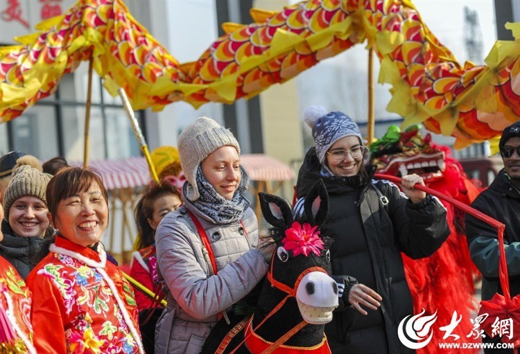 不仅如此,国际友人还与演员们一同登上舞台,参与舞龙、跑驴、划旱船等民俗演出。他们跟着演员们的节奏,有模有样地表演着,与现场观众共同分享这份欢乐与喜悦。现场观众纷纷为他们的精彩表现鼓掌喝彩,将大集的气氛推向了高潮。